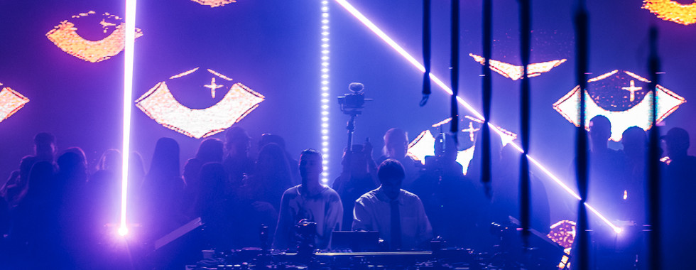 Content design by OMBRA World sat at the centre of the room on two large portrait-oriented screens, one for each member of the duo. The framing pulled Prospa out of the booth and onto a shared video canvas, giving a traditionally static performance posture a front-of-room presence that scaled to Magazine's capacity. Feeding that canvas was a six-operator camera team running a mix of mirrorless, cine and PTZ bodies through a live switch, with gimbal and slider coverage working alongside locked-off positions. The live feed was cut into OMBRA's designed content in real time, so the screens were never just playback. They were reacting to the room.